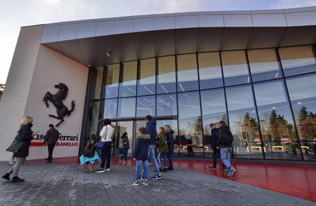 Maranello, Italy, December 2018. Entrance to the Ferrari museum, The black prancing horse leaves no doubt: we are in the home of engines. People stop for a souvenir photo.