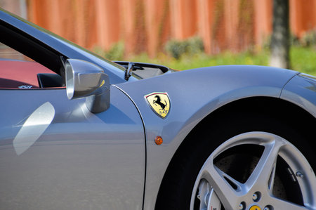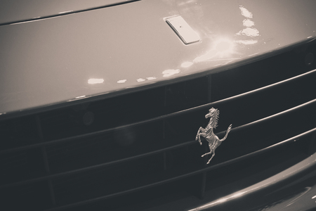 TURIN, ITALY - JUNE 13, 2015: Ferrari logo on a dark silver car on June 13, 2015 in Italy