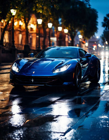 Blue luxury sports car on wet city street at night