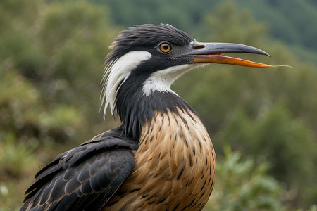 A detailed close-up of a dodo bird with dark plumage and a large hooked beak, set against a lush green background