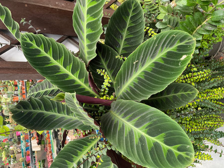 Calathea Ornata Sanderiana on the nursery plants. The plant is known for its large leaves that have a distinctive pattern and effervescent colors.