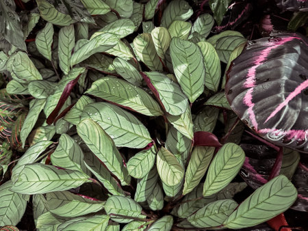 ฺBeautiful green foliage ornamental plant background. Group of Calathea cv. Sanderiana with Calathea makoyana leaves are growing in the garden