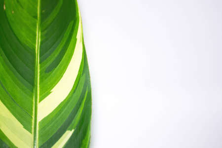Calathea ornata leaves or Pin stripe Calathea, Tropical foliage on side position provides copy space for text. background concept isolated white