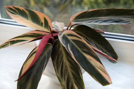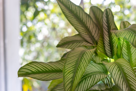 Tropical ornamental plants. Potted plants. Huge Calathea Ornata in the apartment near the window against the background of the greenery of the garden. Close-up. Macro. Outdoor.