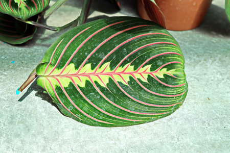 Beautiful maranta leaves with an ornament on a gray background close-up. Maranthaceae family is an unpretentious plant. copyspace. Growing potted house plants, green home decor, care and cultivation