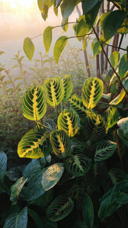 The Maranta flower at dawn, soft golden sunlight kissing leaves, clean air, natural color tone.