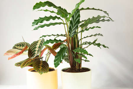 A group of popular potted house plants: Calathea, Maranta, Marantaceae, Haworthia, Ficus lirata, Benjamin, Echeveria. Growing potted house plants, green home decor, care and cultivation
