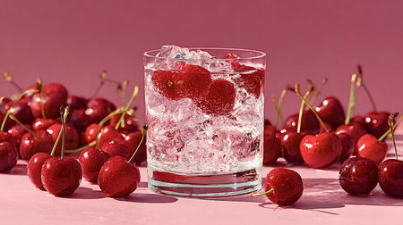 Refreshing summer drink with cherries and ice cubes in a glass, surrounded by fresh cherries on a vibrant pink background, creating a cool and inviting scene