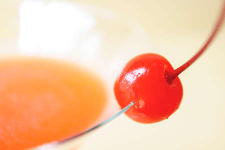 Refreshing cherry cocktail served in a crystal glass with ice on a marble countertop