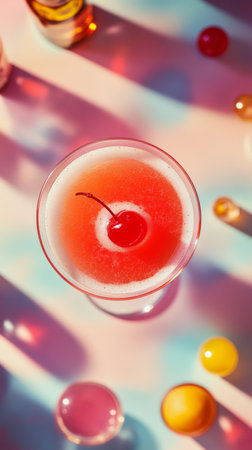 A vibrant cocktail glass with ice and a cherry sits against a colorful bokeh background, creating a festive and refreshing scene perfect for summer gatherings.