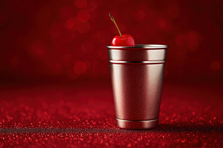 A metallic cup featuring a cherry on top, set against a vibrant red background. This image captures the essence of cocktails and festive celebrations.ai generated.