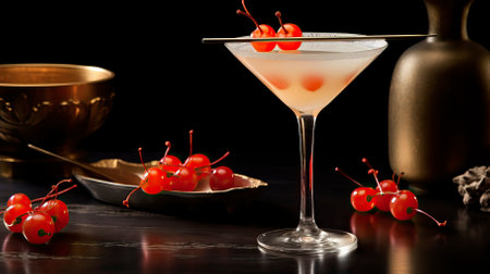 Elegant martini glass with cocktail and cherries on a bar counter with a blurred background.