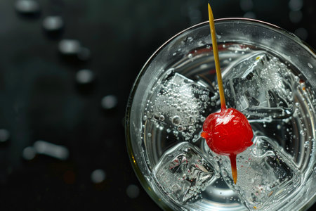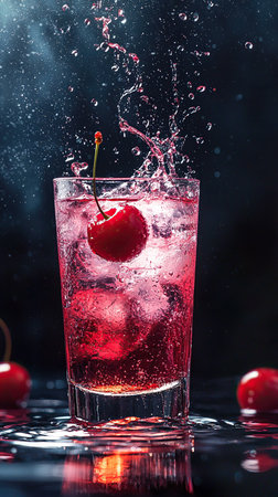 Refreshing cherry cocktail served in a glass with ice cubes on a dark surface during a casual evening gathering
