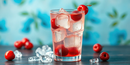 Refreshing cherry drink with ice served in a glass against a colorful floral background