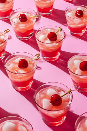 Valentine cocktails diagonally arranged in equal regular intervals on a pink background in the style of photography installations, advertising-inspired.