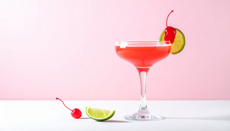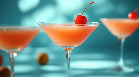 This pink guava-based cocktail is presented in an elegant martini glass, accentuated by a bright red cherry on top, set against a light blue background in soft lighting, creating a refreshing vibe.