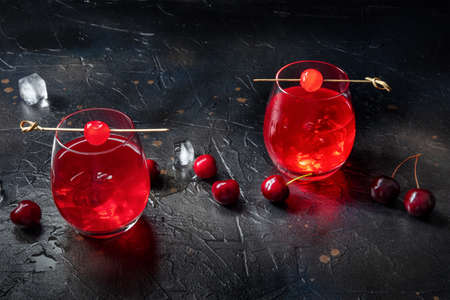 Cocktail cherry and a mocktail on a dark background, a vibrant red drink with ice, two glasses