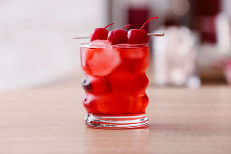 Refreshing cherry and lemon drink with ice served in a glass at a bright bar countertop