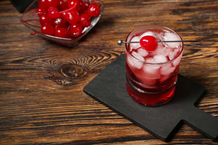 Glass of tasty Manhattan cocktail with cherries on table, closeup