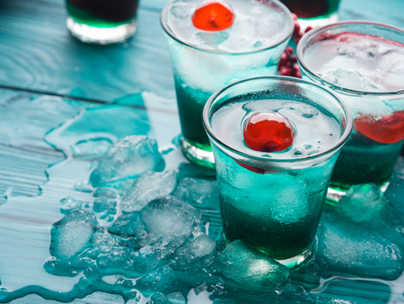 Short alcohol green drinks with cherry and crushed ice. Christmas Saint Patrick day holiday shot