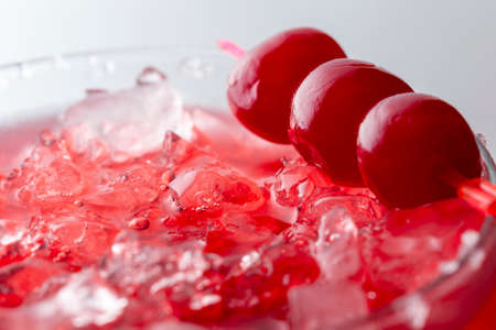 Refreshing cherry drink with ice served against a vibrant red backdrop. Perfect for summer days and festive gatherings.