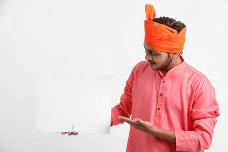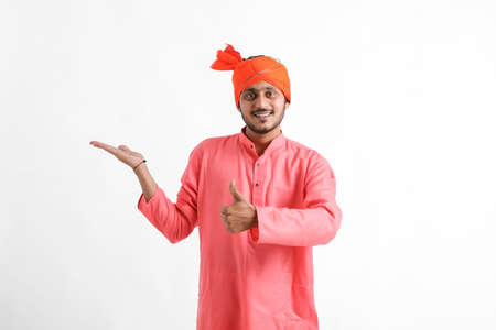 South Indian handsome man in full sleeves holding palms together with welcome expression. Vanakkam. White background