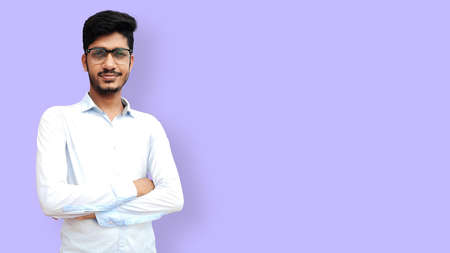 Smiling young indian business man wearing suit and glasses. Headshot portrait