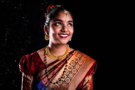 Portrait of a smiling Indian woman wearing saree and traditional clothes