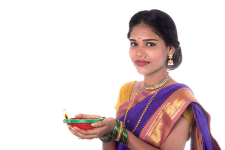 Portrait of a woman holding diya, Diwali or deepavali photo with female hands holding oil lamp during festival of light on white background