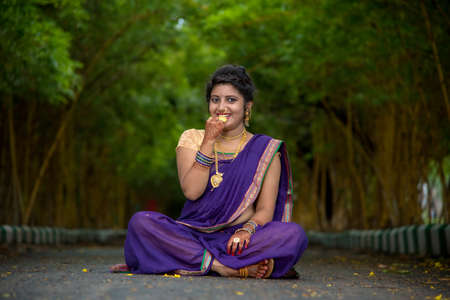 Beautiful Indian young girl in Traditional Saree posing outdoors