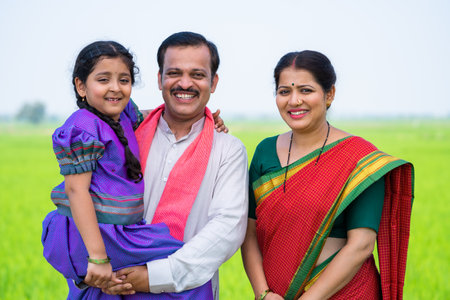 Portrait shot of Happy smiling Indian village farming couple with kid standing by looking at camera near paddy farmland - concept of relationship,family harmony and togetherness