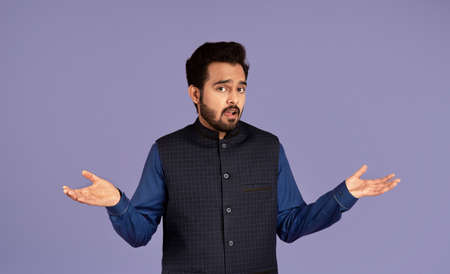 Who knows. Confused Indian guy shrugging shoulders on violet background, panorama