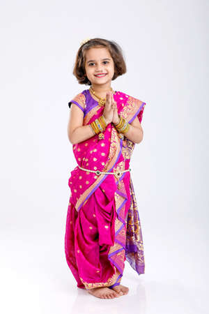 Young Indian traditional girl using a mobile phone or smartphone isolated on a white background