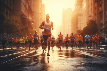 Determined athlete running ahead during a city marathon at sunrise, reflecting commitment and endurance
