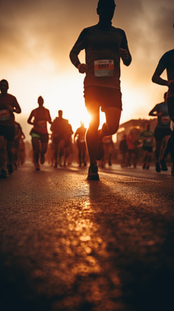 At sunset, runners sprint across a city street during a marathon, showcasing determination and athleticism among cheering spectators in a vibrant atmosphere.
