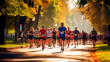 The throng of runners moves in a blur as they traverse the verdant city streets, the golden light casting a warm and vibrant glow. The crowd of runners moves in unison during the marathon along the green city streets, and the warm, golden sunlight creates an energetic atmosphere. The mass race in the metropolis. High quality photo