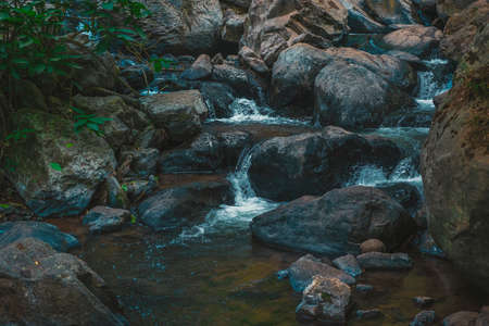 The wild landscape of a rivers with rocks. The river flows through the fall of the Velo de Novia waterfall. View of the rocks of the forest river in the ecological park Velo de Novia in Mexico
