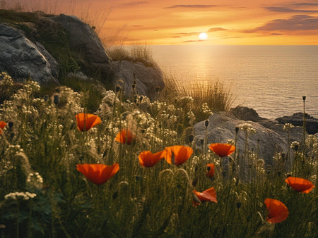 Landscape with sunrise over sea and vast poppy field. Generative AI