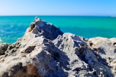 Beautiful crystal clear blue waters of the caribbean sea on rocky shoreline