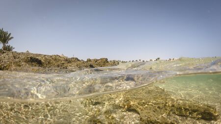 View of the beach on the background of palm trees and the bottom of the sea. Underwater split shot photos