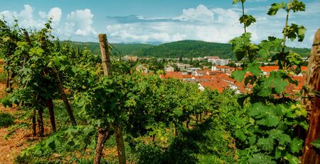 Vineyard on hill and old city with red roofs in the valley. Grape bushes closeup top view