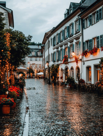 A wet cobblestone street reflects light in this image, lined with buildings featuring shuttered windows and floral arrangements. Strings of lights illuminate the trees and architecture. The overcast sky and muted colors contribute to the atmospheric mood. This scene could be suitable for various commercial or editorial applications.