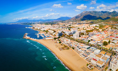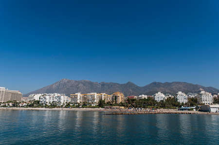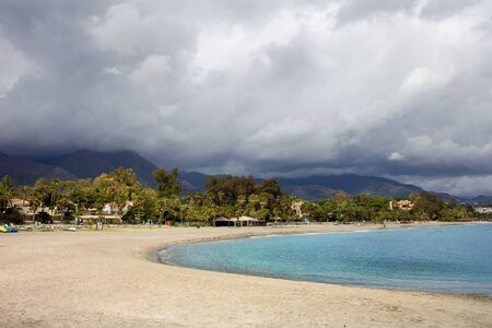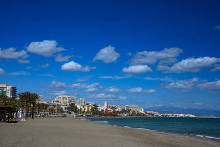 Marbella coastline with wide sandy beach by the Mediterranean Sea in Spain, Malaga province, Andalusia region.