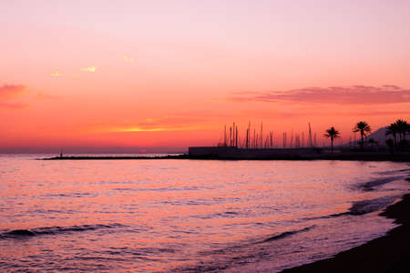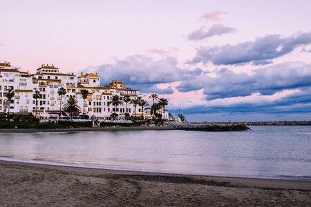 Sunset landscape. View of Puerto Banus, Marbella. Costa del Sol, Andalusia, Spain. Picture taken? 3 March 2019.