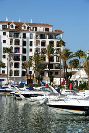 View of the harbour with apartment blocks to the rear, Puerto Cabopino, Marbella, Costa del Sol, Malaga Province, Andalucia, Spain.