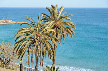 Palm trees and sea coast with blue sky at background in Catalonia, Spain