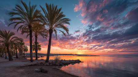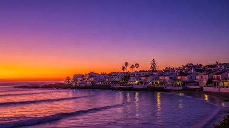 The image captures a coastal town at sunset with a vibrant sky. The water reflects the warm hues of orange and purple. Buildings line the coast, and palm trees add to the picturesque view. The calm water mirrors the sunset, creating a serene and captivating scene.