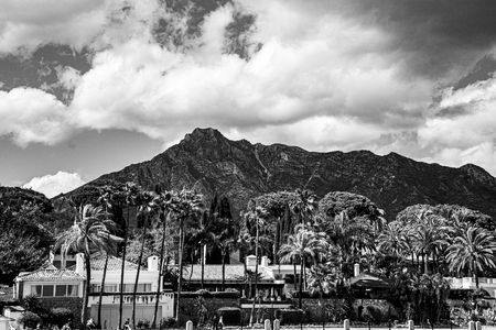 beautiful black and white panorama of the mountains behind Puerto Banus in Spain