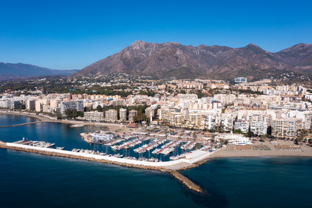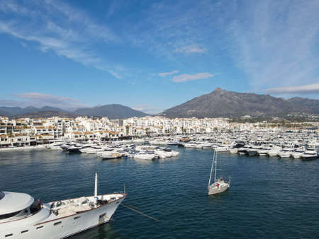 Aerial drone perspective of beautiful over luxury Puerto Banus Bay in Marbella. Spain