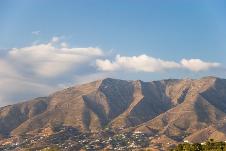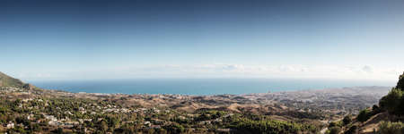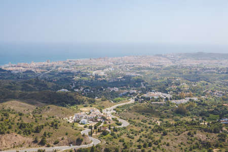 Beautiful view from the hill to the village of Mijas on the green mountains with trees and shrubs. Perfect landscape. Southern Spain